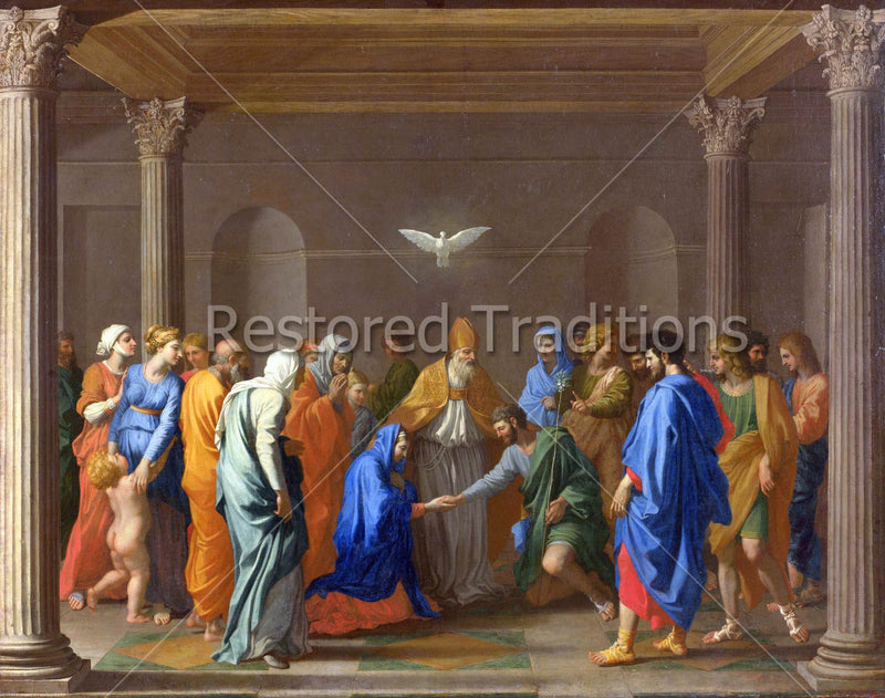 This artwork by Poussin shows the wedding of the Virgin Mary to St. Joseph. Mary and Joseph kneel across from each other in front of a priest, clasping their right hands together. Joseph holds a stalk of lilies in his left hand, symbolizing his love of chastity. The Holy Ghost, in the form of a dove, hovers in the air above the couple. The wedding guests joyfully look on.