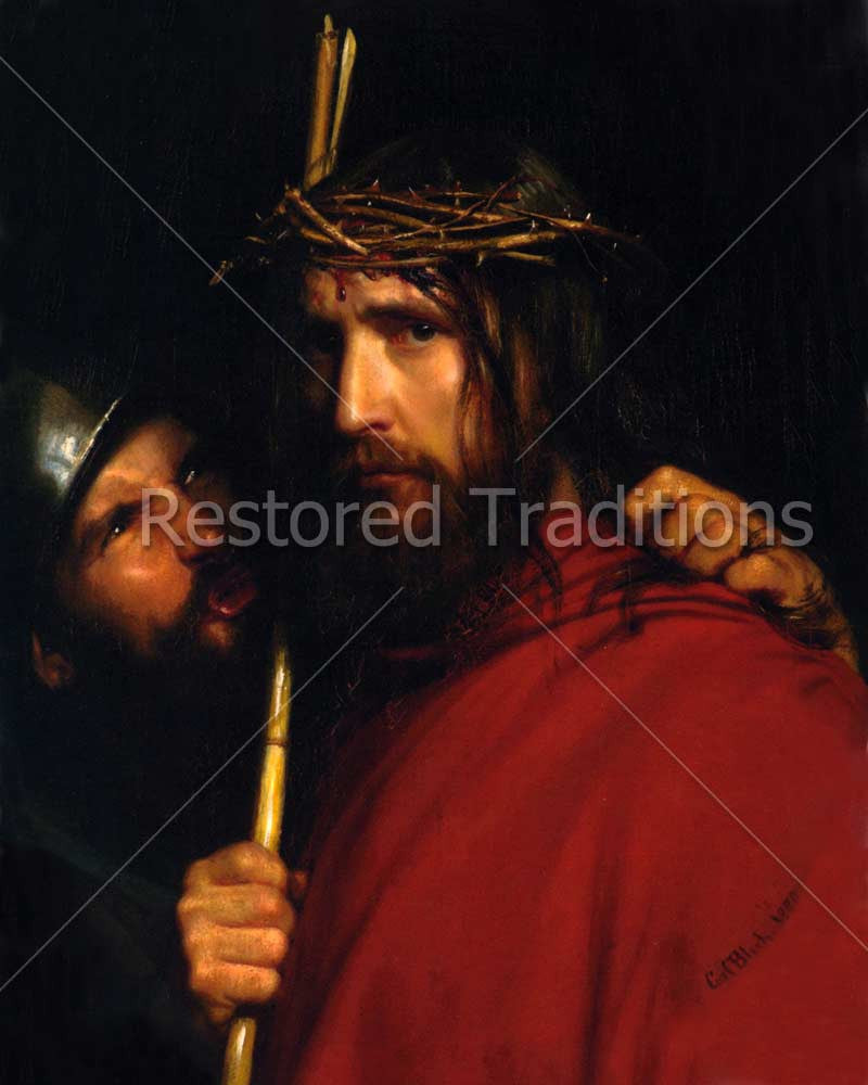 This artwork by C. Bloch shows a soldier mocking Jesus Christ, who is wearing a crown of thorns, holding a reed, and wearing a red cloak.