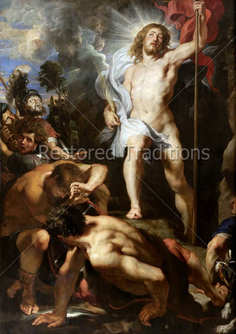 The terrified soldiers cower in fear as the triumphant Jesus rises from His tomb. Artwork by Peter Paul Rubens.