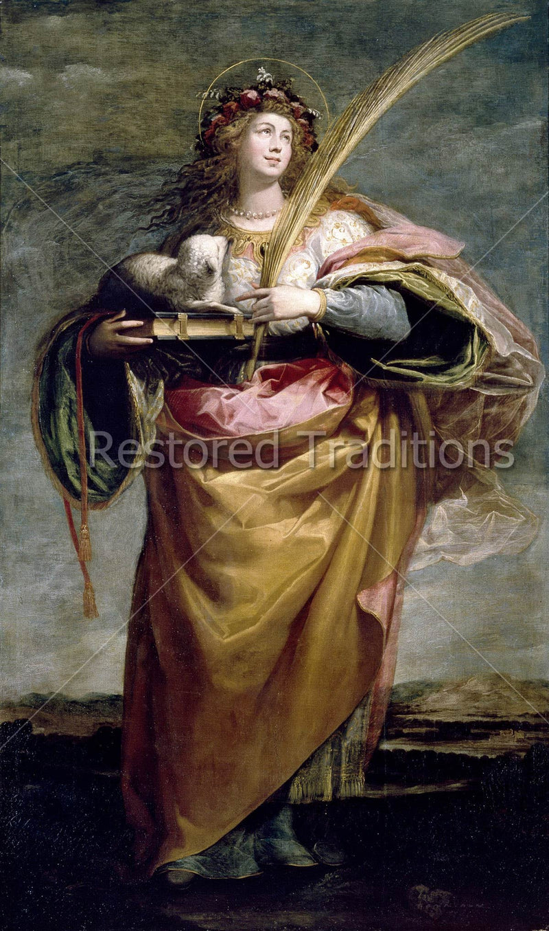 This portrait of Saint Agnes shows the martyr wearing a floral wreath to signify her virginity, holding a palm to symbolize her martyrdom, and holding a lamb to represent her name. Artwork by Carducci.