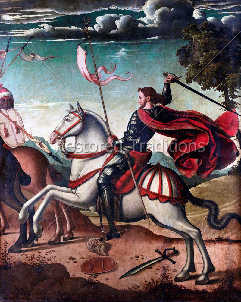 Saint James the Apostle appears in the Battle of Clavijo to lead the Christian army in victory against the Moors. The Apostle James is known as the Patron Saint of Spain and is called Santiago Matamoros, James the Moor-Killer. This artwork was originally produced at the School of Valencia in the sixteenth century.
