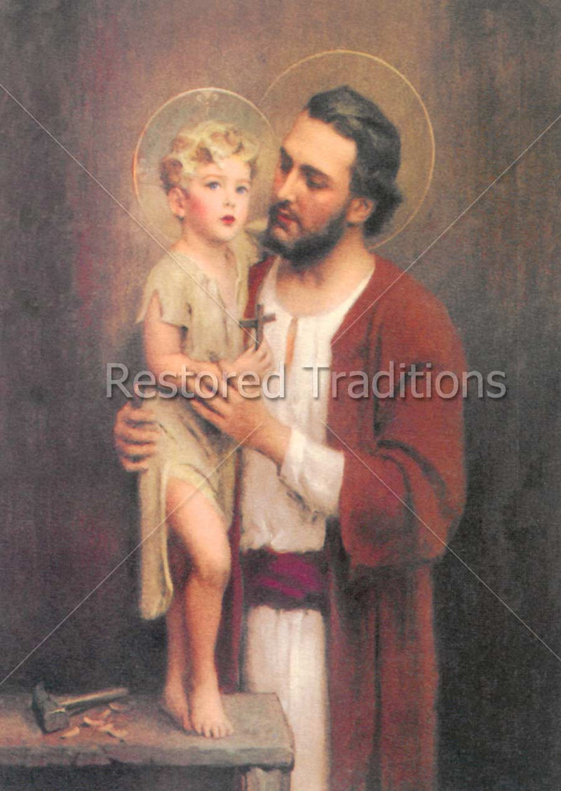The boy Jesus, held by Saint Joseph, stands on His Foster Father's carpentry table and holds a tiny cross. Artwork by Chambers.