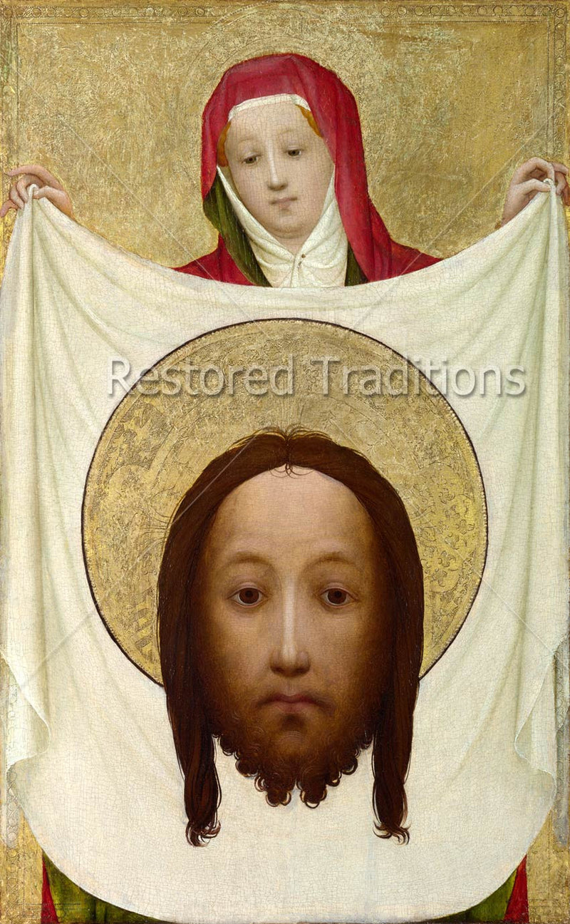 This artwork, by the Master of Saint Veronica, shows Veronica holding up the veil she used to wipe the Holy Face of Christ, displaying the miraculous image of the Savior which was imprinted on the veil.