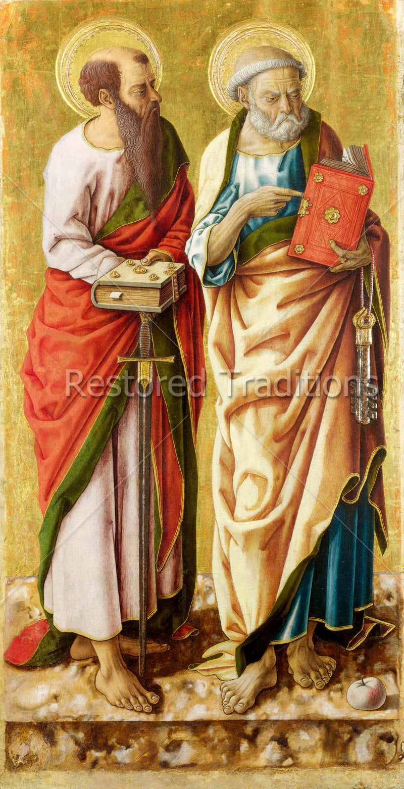 This artwork by C. Crivelli shows the First Pope, Saint Peter, and the great Apostle of the Gentiles, Saint Paul. Peter holds the keys to the Kingdom of Heaven, while Paul holds his sword.