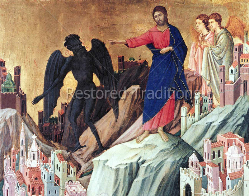Satan tempts Jesus with the riches and power of the world atop a cliff overlooking kingdoms and Christ casts the demon away. Angels arrive to minister to the Savior. Artwork by fourteenth-century artist, D. Buoninsegna.