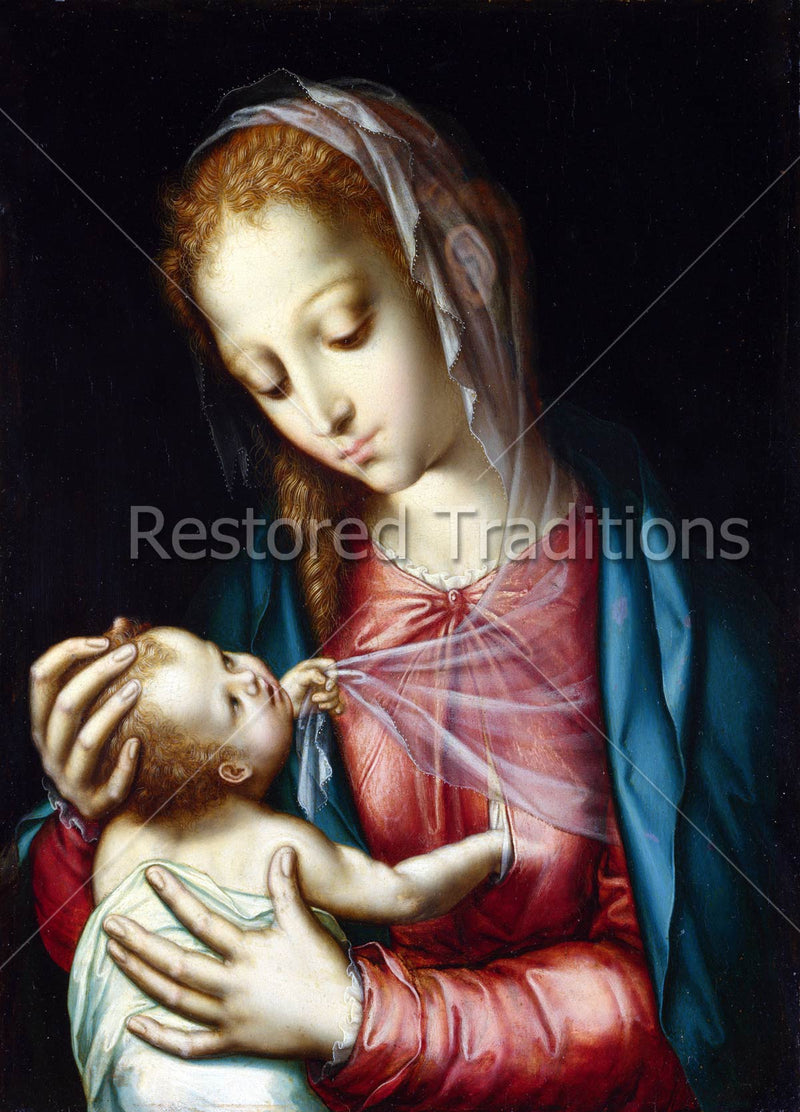 The Madonna lovingly holds the Baby Jesus in such a way that the two look into each other's eyes. Artwork by Morales.